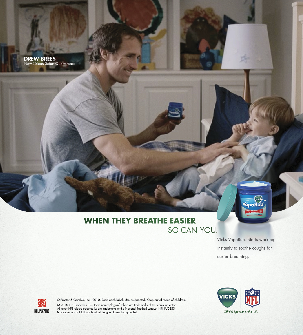 Here we have another ad, but this is a actually countering a gender stereotype. Usually when there is an advertisement for children with colds and illnesses you see the nurturing mother caring for her babies. Vicks and the NFL decided to counter that. Here you see a little boy who is sick but is being cared for by his father. The little boy seems elated to have is father there with him. This s saying that men are just as capable of stepping into the caregiver role. Another stereotype is that only men and boys like football. By the ad being partnered with the NFL and there are no females, it send the messages that only males like football.